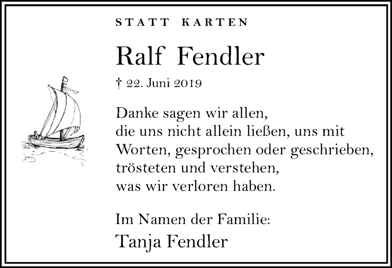 Hier finden Sie alle Traueranzeigen aus der Zeitung, die bisher für Ralf Fendler erschienen sind. Weitere Traueranzeigen, die in der Zeitung erscheinen, werden hier ebenfalls aufgelistet