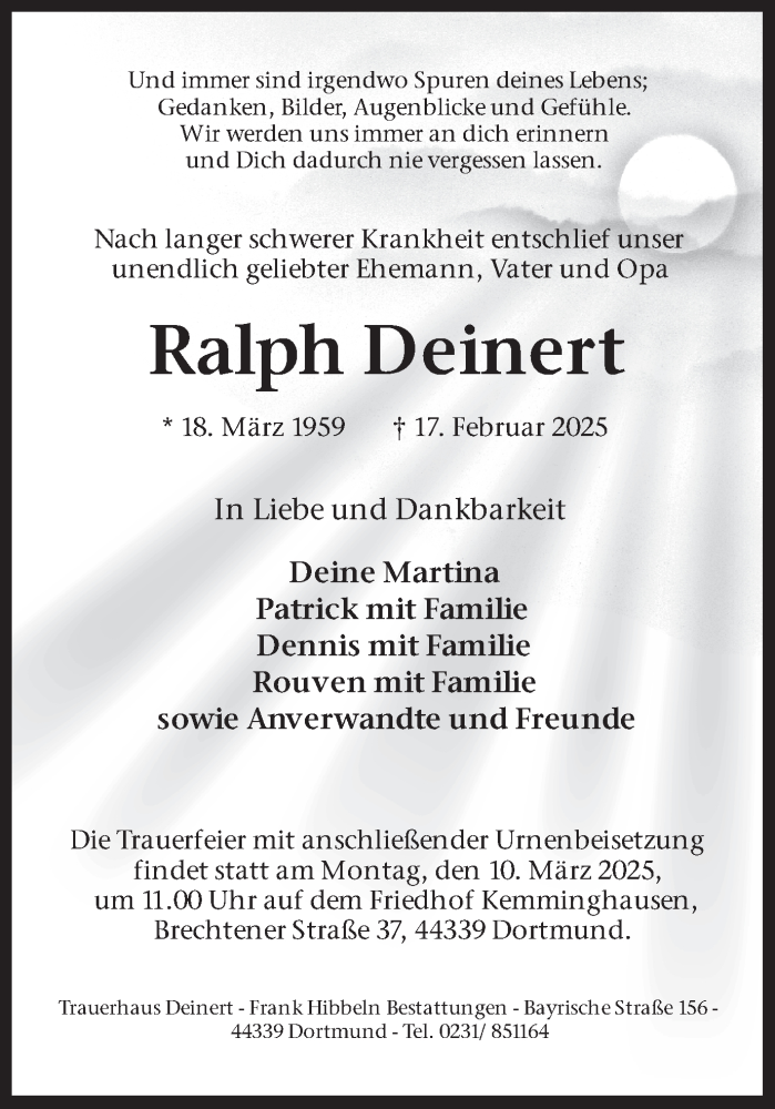 Hier finden Sie alle Traueranzeigen aus der Zeitung, die bisher für Ralph Deinert erschienen sind. Weitere Traueranzeigen, die in der Zeitung erscheinen, werden hier ebenfalls aufgelistet