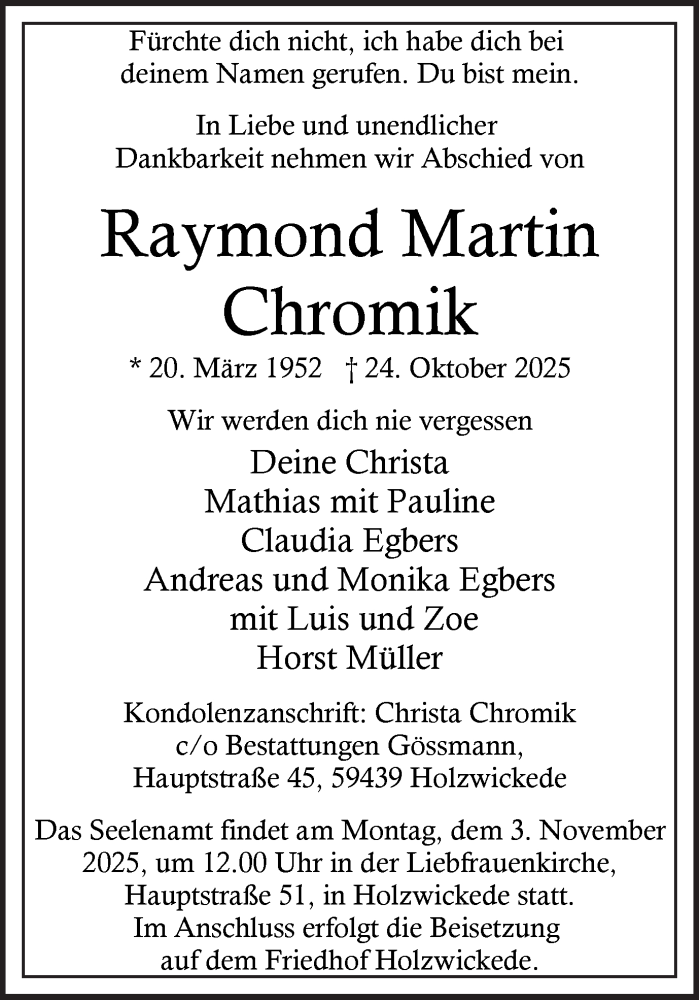 Hier finden Sie alle Traueranzeigen aus der Zeitung, die bisher für Raymond Martin Chromik erschienen sind. Weitere Traueranzeigen, die in der Zeitung erscheinen, werden hier ebenfalls aufgelistet