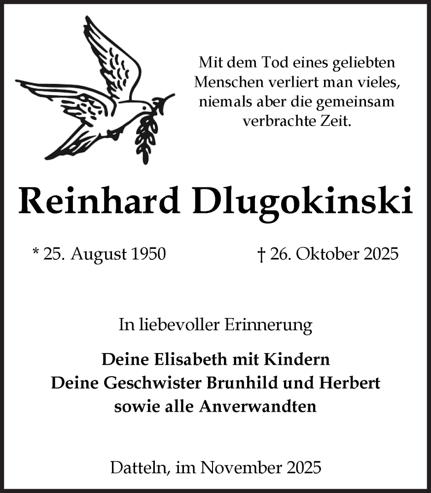 Hier finden Sie alle Traueranzeigen aus der Zeitung, die bisher für Reinhard Dlugokinski erschienen sind. Weitere Traueranzeigen, die in der Zeitung erscheinen, werden hier ebenfalls aufgelistet