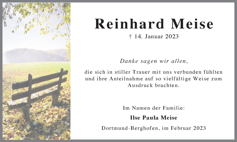 Hier finden Sie alle Traueranzeigen aus der Zeitung, die bisher für Reinhard Meise erschienen sind. Weitere Traueranzeigen, die in der Zeitung erscheinen, werden hier ebenfalls aufgelistet