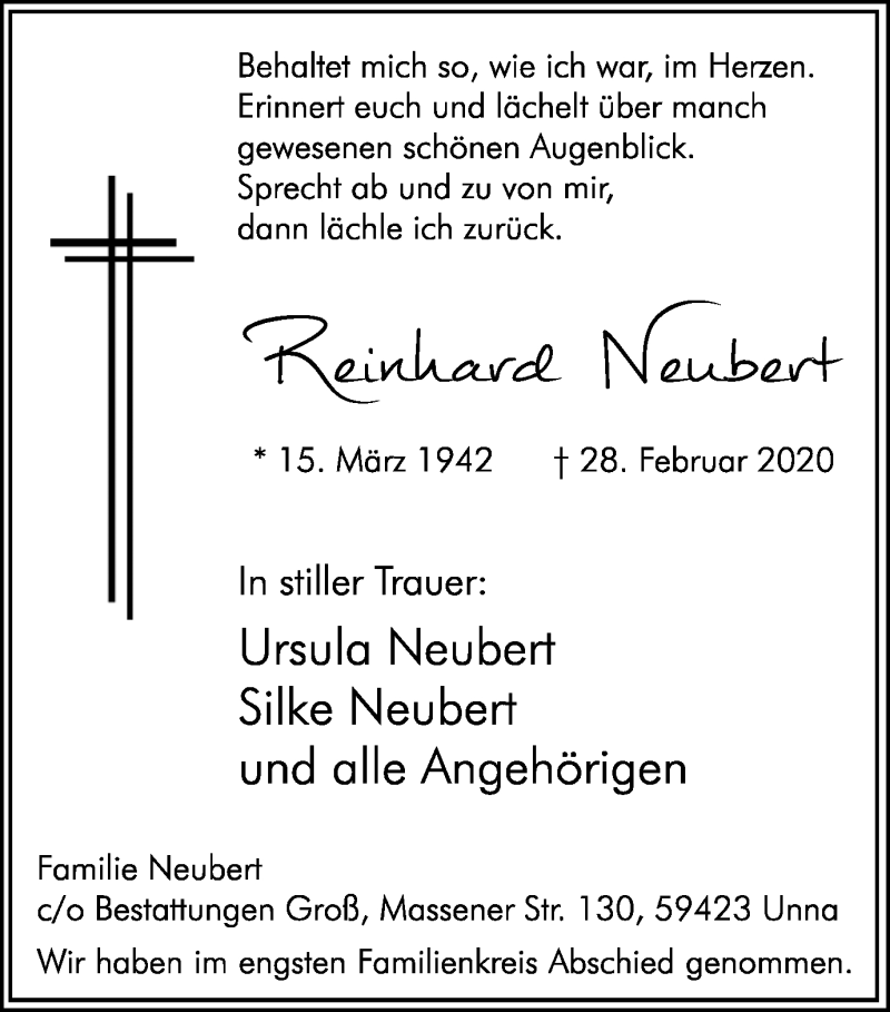 Hier finden Sie alle Traueranzeigen aus der Zeitung, die bisher für Reinhard Neubert erschienen sind. Weitere Traueranzeigen, die in der Zeitung erscheinen, werden hier ebenfalls aufgelistet