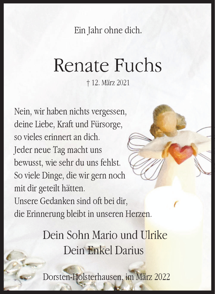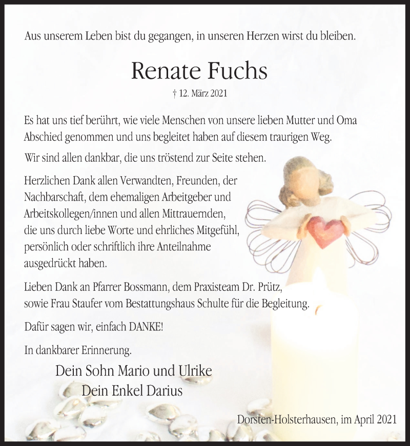 Hier finden Sie alle Traueranzeigen aus der Zeitung, die bisher für Renate Fuchs erschienen sind. Weitere Traueranzeigen, die in der Zeitung erscheinen, werden hier ebenfalls aufgelistet