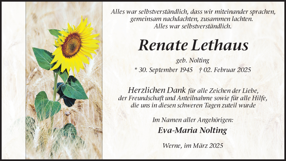Hier finden Sie alle Traueranzeigen aus der Zeitung, die bisher für Renate Lethaus erschienen sind. Weitere Traueranzeigen, die in der Zeitung erscheinen, werden hier ebenfalls aufgelistet