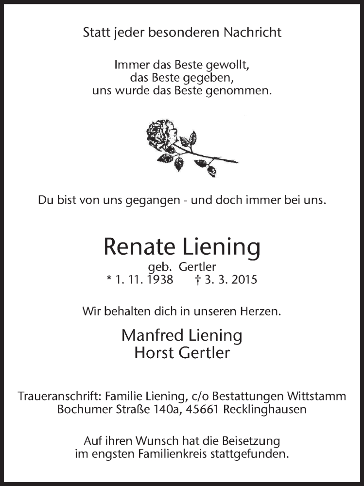 Hier finden Sie alle Traueranzeigen aus der Zeitung, die bisher für Renate Liening erschienen sind. Weitere Traueranzeigen, die in der Zeitung erscheinen, werden hier ebenfalls aufgelistet