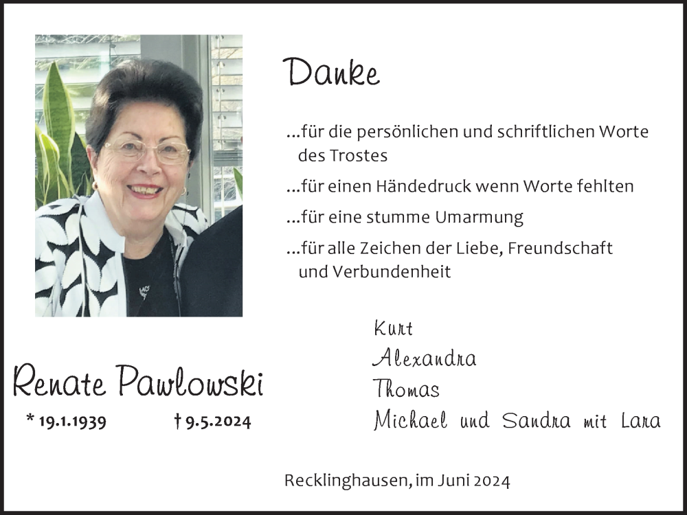 Hier finden Sie alle Traueranzeigen aus der Zeitung, die bisher für Renate Pawlowski erschienen sind. Weitere Traueranzeigen, die in der Zeitung erscheinen, werden hier ebenfalls aufgelistet