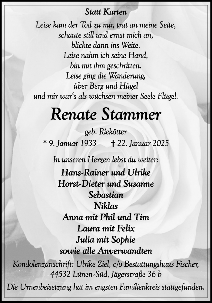 Hier finden Sie alle Traueranzeigen aus der Zeitung, die bisher für Renate Stammer erschienen sind. Weitere Traueranzeigen, die in der Zeitung erscheinen, werden hier ebenfalls aufgelistet