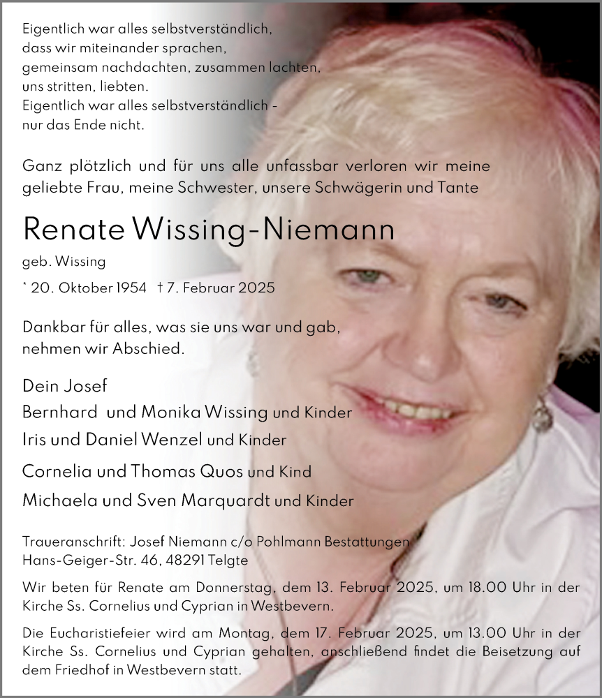 Hier finden Sie alle Traueranzeigen aus der Zeitung, die bisher für Renate Wissing-Niemann erschienen sind. Weitere Traueranzeigen, die in der Zeitung erscheinen, werden hier ebenfalls aufgelistet