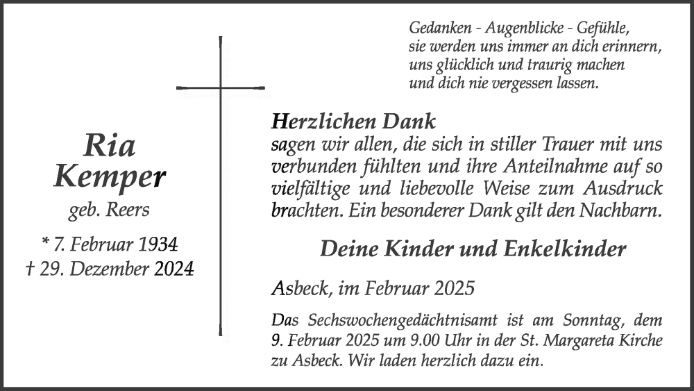 Hier finden Sie alle Traueranzeigen aus der Zeitung, die bisher für Ria Kemper erschienen sind. Weitere Traueranzeigen, die in der Zeitung erscheinen, werden hier ebenfalls aufgelistet