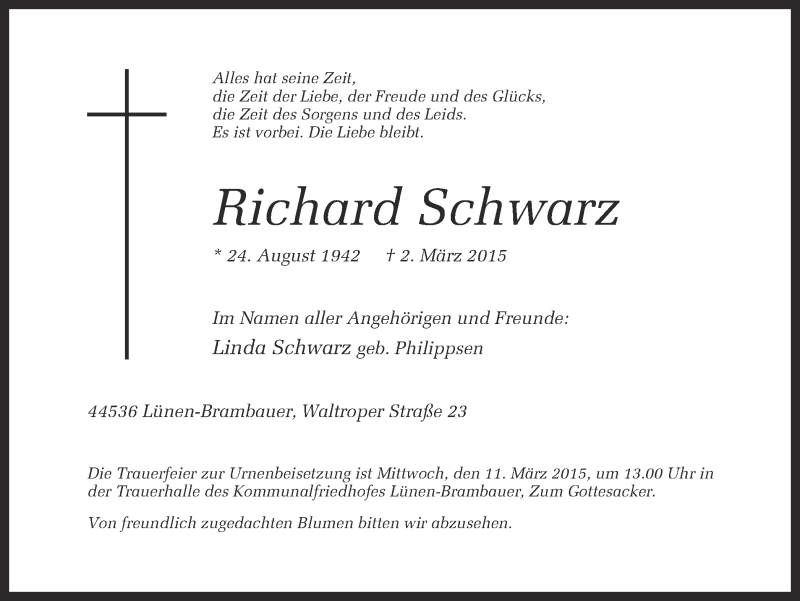 Hier finden Sie alle Traueranzeigen aus der Zeitung, die bisher für Richard Schwarz erschienen sind. Weitere Traueranzeigen, die in der Zeitung erscheinen, werden hier ebenfalls aufgelistet