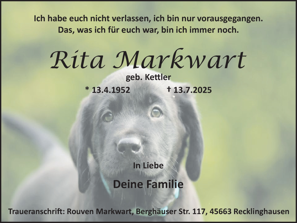 Hier finden Sie alle Traueranzeigen aus der Zeitung, die bisher für Rita Markwart erschienen sind. Weitere Traueranzeigen, die in der Zeitung erscheinen, werden hier ebenfalls aufgelistet