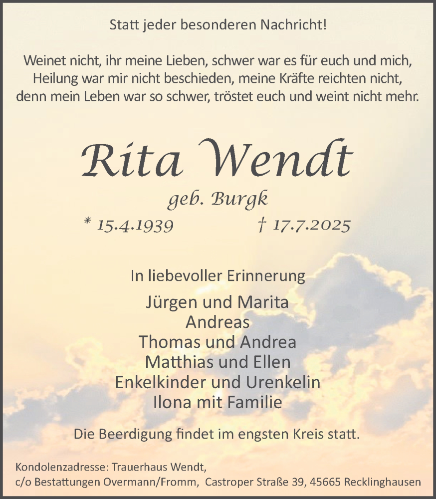 Hier finden Sie alle Traueranzeigen aus der Zeitung, die bisher für Rita Wendt erschienen sind. Weitere Traueranzeigen, die in der Zeitung erscheinen, werden hier ebenfalls aufgelistet