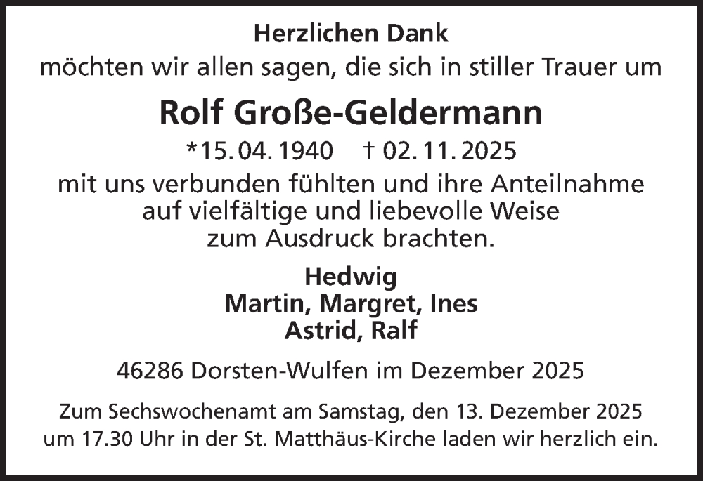Hier finden Sie alle Traueranzeigen aus der Zeitung, die bisher für Rolf Große Geldermann erschienen sind. Weitere Traueranzeigen, die in der Zeitung erscheinen, werden hier ebenfalls aufgelistet
