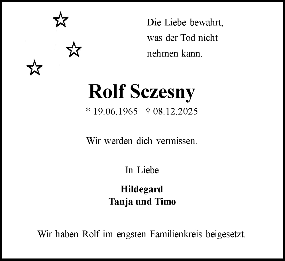 Hier finden Sie alle Traueranzeigen aus der Zeitung, die bisher für Rolf Sczesny erschienen sind. Weitere Traueranzeigen, die in der Zeitung erscheinen, werden hier ebenfalls aufgelistet