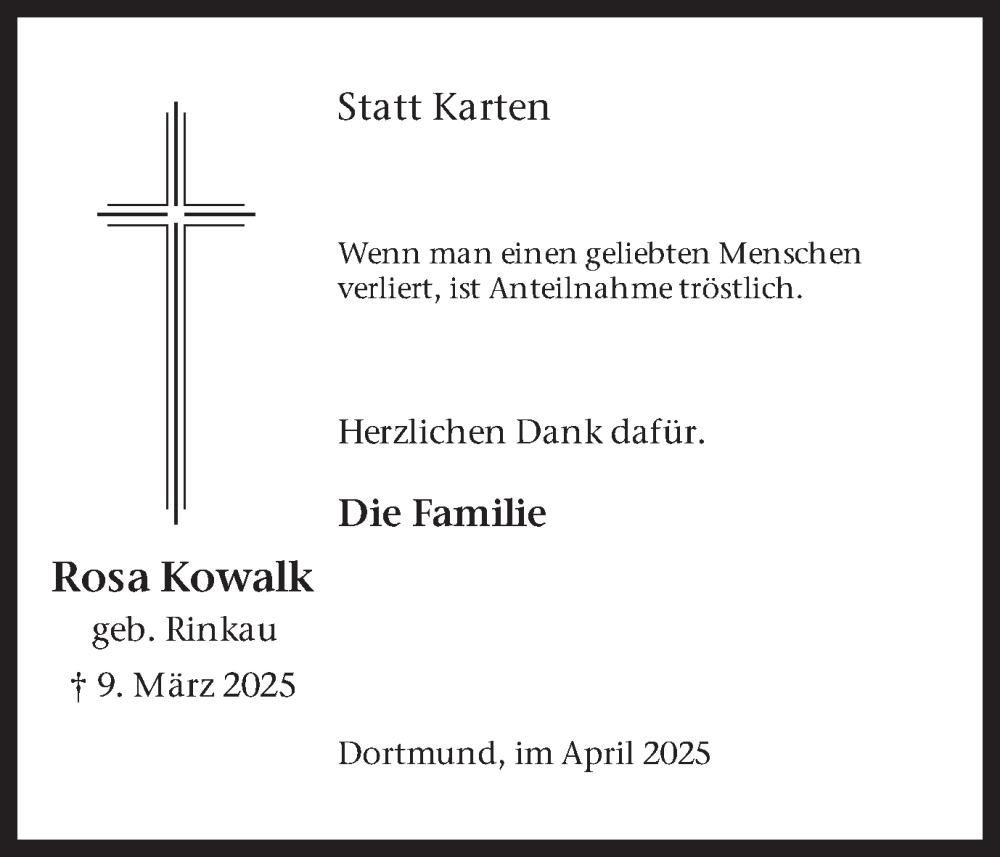 Hier finden Sie alle Traueranzeigen aus der Zeitung, die bisher für Rosa Kowalk erschienen sind. Weitere Traueranzeigen, die in der Zeitung erscheinen, werden hier ebenfalls aufgelistet