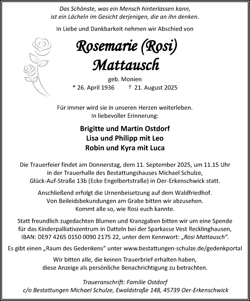 Hier finden Sie alle Traueranzeigen aus der Zeitung, die bisher für Rosemarie Mattausch erschienen sind. Weitere Traueranzeigen, die in der Zeitung erscheinen, werden hier ebenfalls aufgelistet