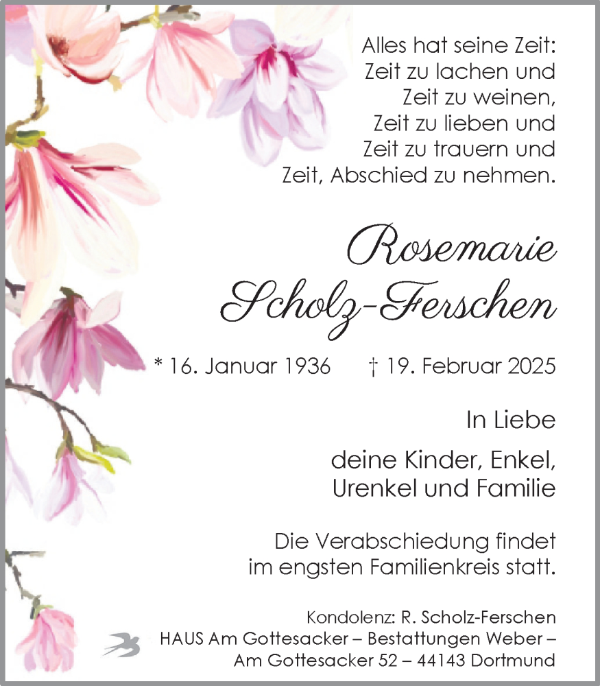 Hier finden Sie alle Traueranzeigen aus der Zeitung, die bisher für Rosemarie Scholz-Ferschen erschienen sind. Weitere Traueranzeigen, die in der Zeitung erscheinen, werden hier ebenfalls aufgelistet