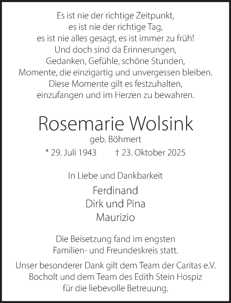 Hier finden Sie alle Traueranzeigen aus der Zeitung, die bisher für Rosemarie Wolsink erschienen sind. Weitere Traueranzeigen, die in der Zeitung erscheinen, werden hier ebenfalls aufgelistet