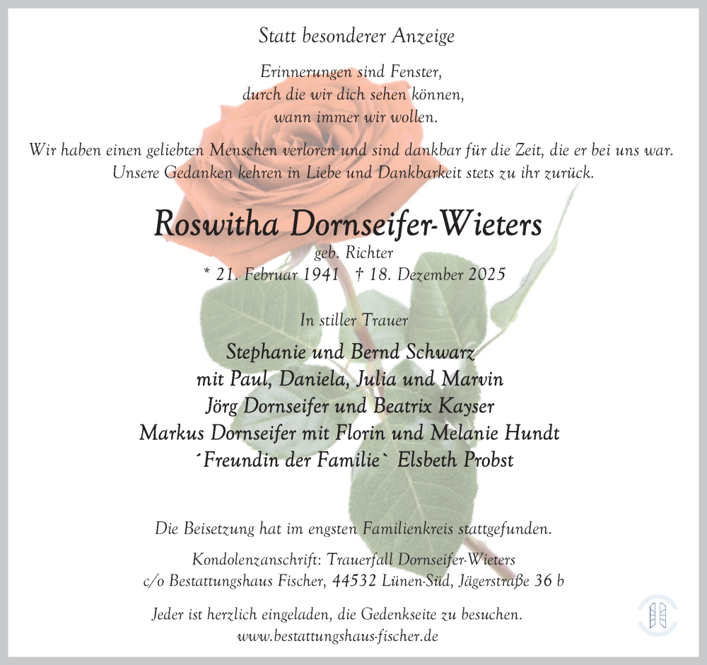 Hier finden Sie alle Traueranzeigen aus der Zeitung, die bisher für Roswitha Dornseifer-Wieters erschienen sind. Weitere Traueranzeigen, die in der Zeitung erscheinen, werden hier ebenfalls aufgelistet