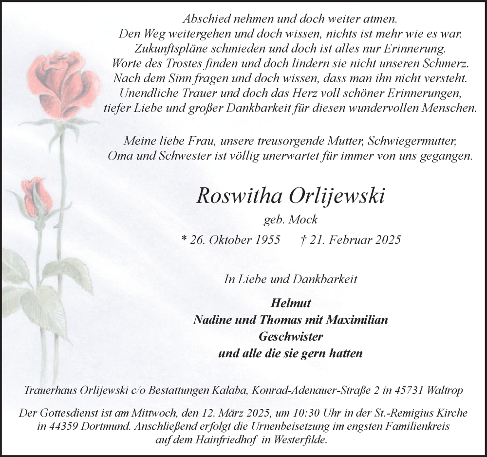 Hier finden Sie alle Traueranzeigen aus der Zeitung, die bisher für Roswitha Orlijewski erschienen sind. Weitere Traueranzeigen, die in der Zeitung erscheinen, werden hier ebenfalls aufgelistet