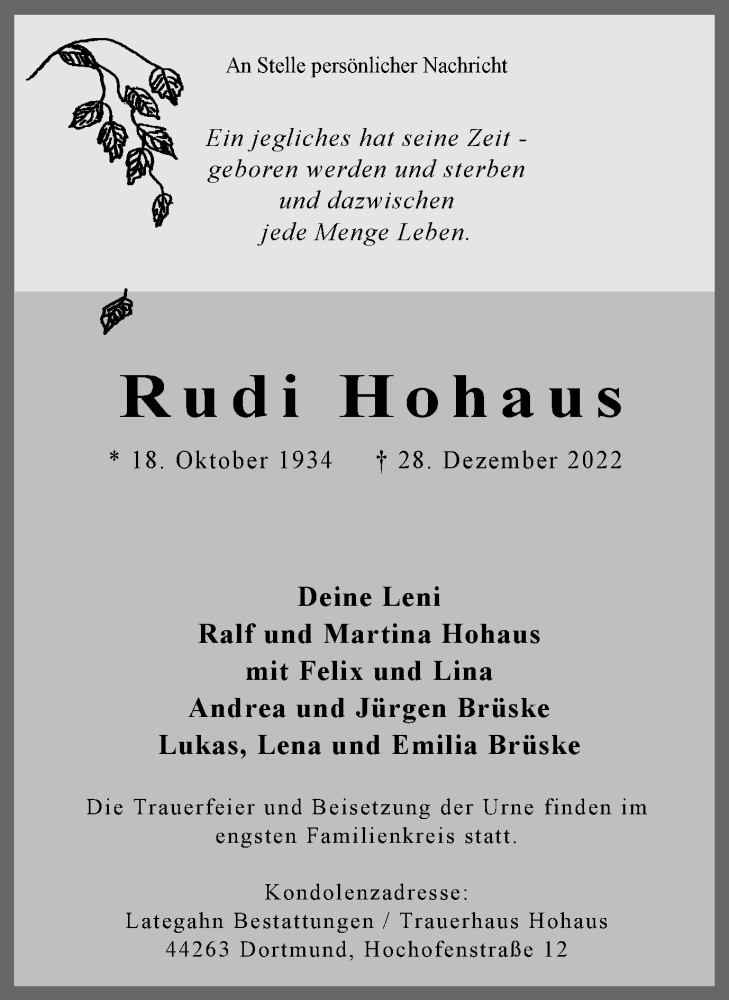 Hier finden Sie alle Traueranzeigen aus der Zeitung, die bisher für Rudi Hohaus erschienen sind. Weitere Traueranzeigen, die in der Zeitung erscheinen, werden hier ebenfalls aufgelistet