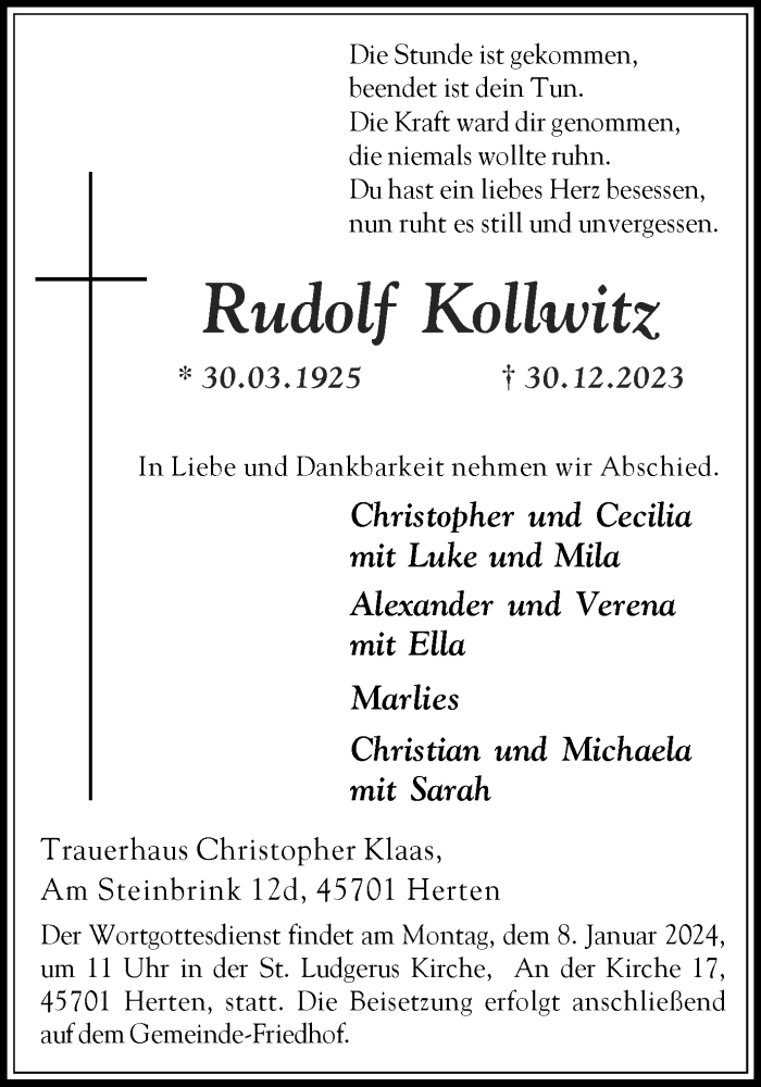 Hier finden Sie alle Traueranzeigen aus der Zeitung, die bisher für Rudolf Kollwitz erschienen sind. Weitere Traueranzeigen, die in der Zeitung erscheinen, werden hier ebenfalls aufgelistet