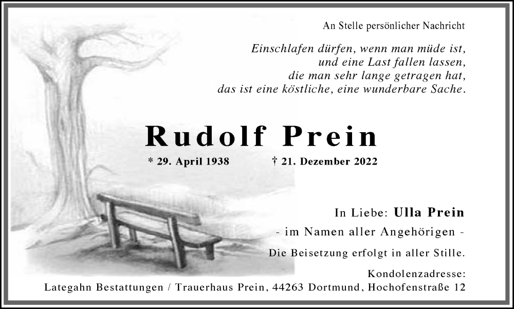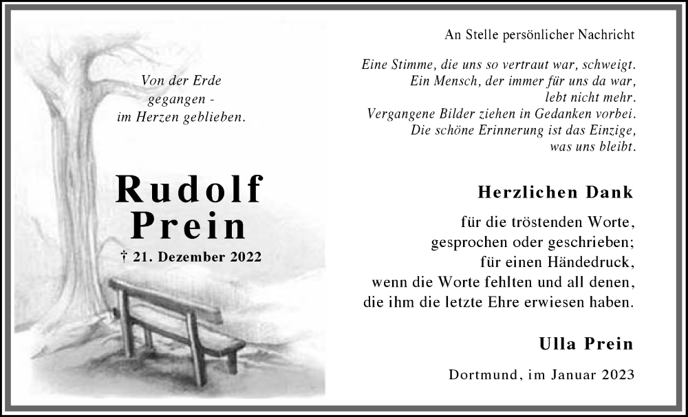 Hier finden Sie alle Traueranzeigen aus der Zeitung, die bisher für Rudolf Prein erschienen sind. Weitere Traueranzeigen, die in der Zeitung erscheinen, werden hier ebenfalls aufgelistet