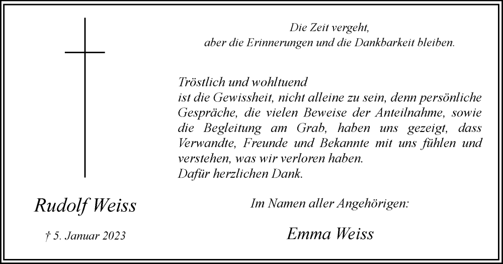 Hier finden Sie alle Traueranzeigen aus der Zeitung, die bisher für Rudolf Weiss erschienen sind. Weitere Traueranzeigen, die in der Zeitung erscheinen, werden hier ebenfalls aufgelistet