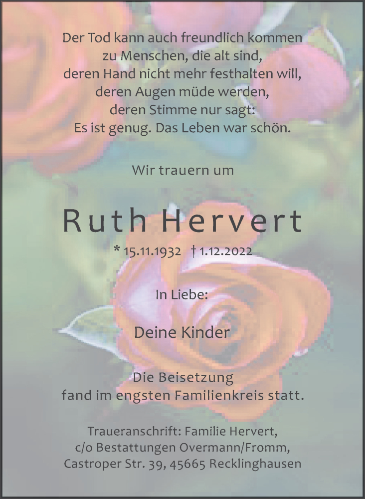 Hier finden Sie alle Traueranzeigen aus der Zeitung, die bisher für Ruth Hervert erschienen sind. Weitere Traueranzeigen, die in der Zeitung erscheinen, werden hier ebenfalls aufgelistet