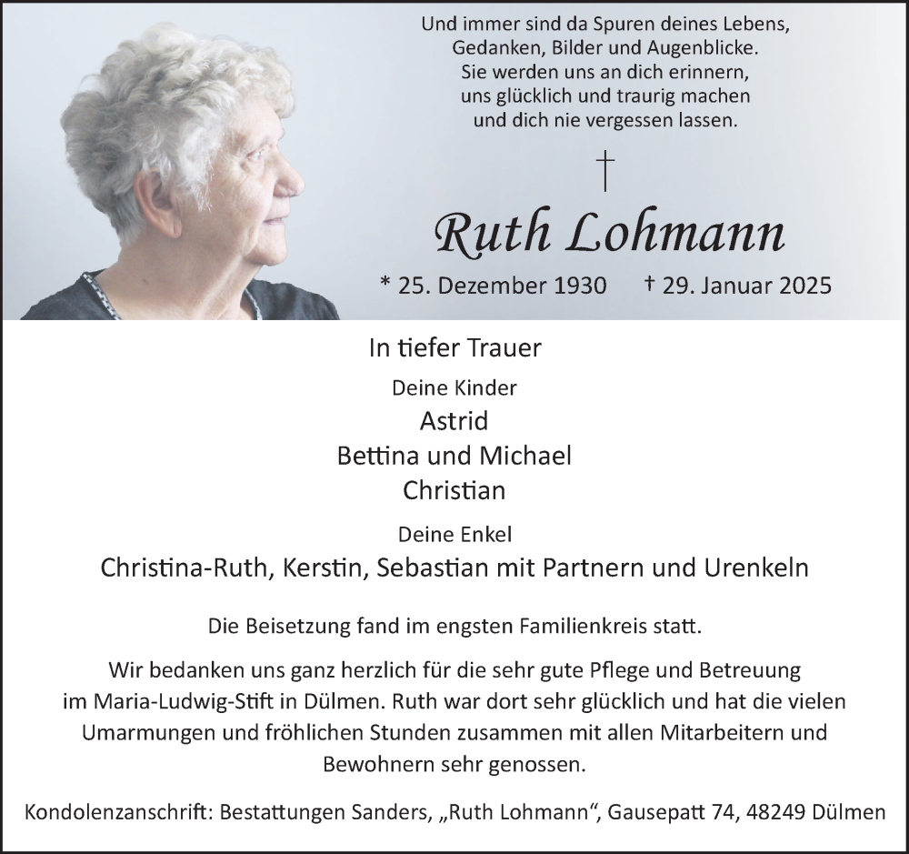 Hier finden Sie alle Traueranzeigen aus der Zeitung, die bisher für Ruth Lohmann erschienen sind. Weitere Traueranzeigen, die in der Zeitung erscheinen, werden hier ebenfalls aufgelistet