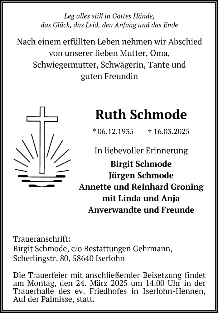 Hier finden Sie alle Traueranzeigen aus der Zeitung, die bisher für Ruth Schmode erschienen sind. Weitere Traueranzeigen, die in der Zeitung erscheinen, werden hier ebenfalls aufgelistet