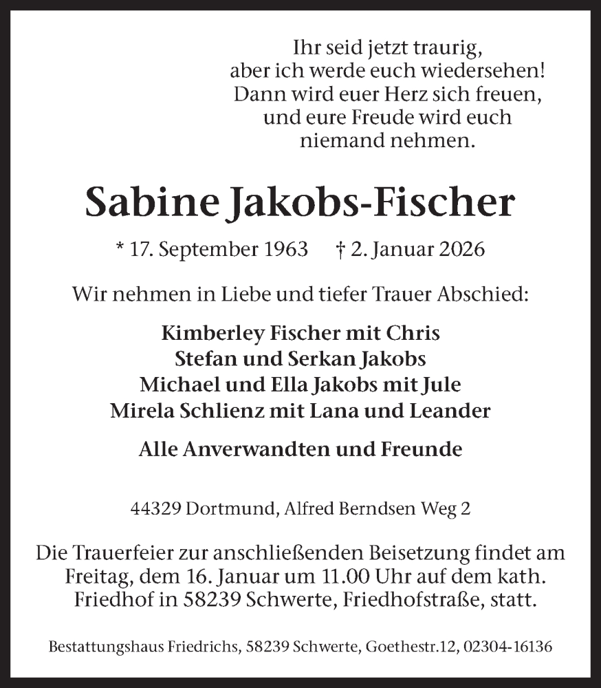 Hier finden Sie alle Traueranzeigen aus der Zeitung, die bisher für Sabine Jakobs-Fischer erschienen sind. Weitere Traueranzeigen, die in der Zeitung erscheinen, werden hier ebenfalls aufgelistet