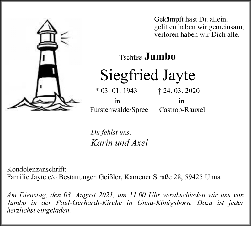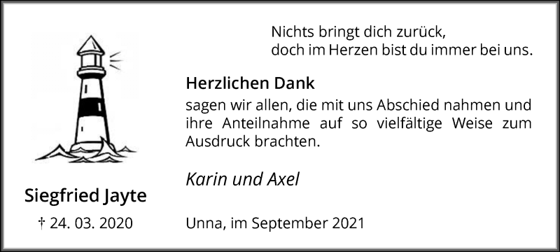 Hier finden Sie alle Traueranzeigen aus der Zeitung, die bisher für Siegfried Jayte erschienen sind. Weitere Traueranzeigen, die in der Zeitung erscheinen, werden hier ebenfalls aufgelistet