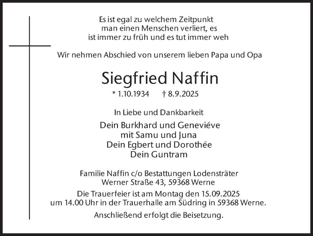 Hier finden Sie alle Traueranzeigen aus der Zeitung, die bisher für Siegfried Naffin erschienen sind. Weitere Traueranzeigen, die in der Zeitung erscheinen, werden hier ebenfalls aufgelistet