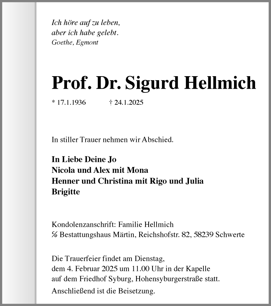 Hier finden Sie alle Traueranzeigen aus der Zeitung, die bisher für Sigurd Hellmich erschienen sind. Weitere Traueranzeigen, die in der Zeitung erscheinen, werden hier ebenfalls aufgelistet