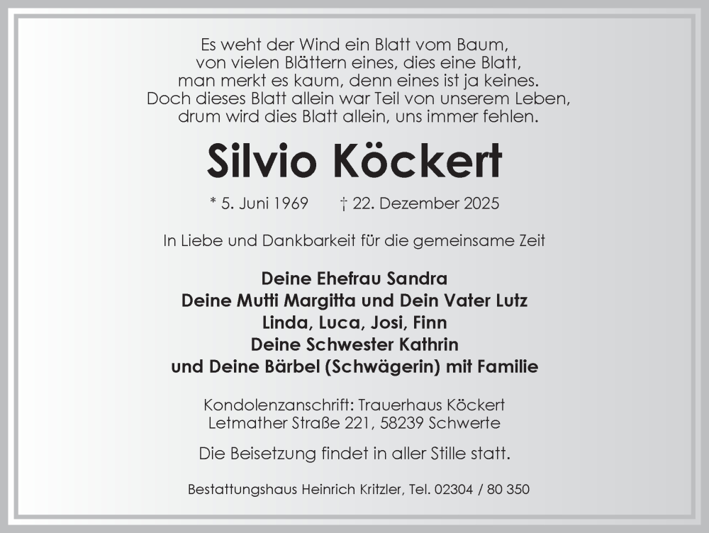 Hier finden Sie alle Traueranzeigen aus der Zeitung, die bisher für Silvio Köckert erschienen sind. Weitere Traueranzeigen, die in der Zeitung erscheinen, werden hier ebenfalls aufgelistet