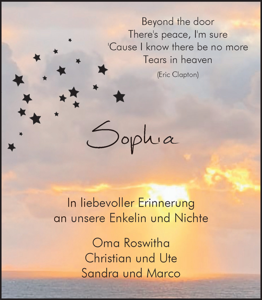 Hier finden Sie alle Traueranzeigen aus der Zeitung, die bisher für Sophia erschienen sind. Weitere Traueranzeigen, die in der Zeitung erscheinen, werden hier ebenfalls aufgelistet