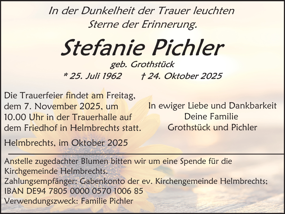 Hier finden Sie alle Traueranzeigen aus der Zeitung, die bisher für Stefanie Pichler erschienen sind. Weitere Traueranzeigen, die in der Zeitung erscheinen, werden hier ebenfalls aufgelistet