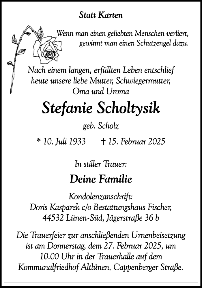 Hier finden Sie alle Traueranzeigen aus der Zeitung, die bisher für Stefanie Scholtysik erschienen sind. Weitere Traueranzeigen, die in der Zeitung erscheinen, werden hier ebenfalls aufgelistet