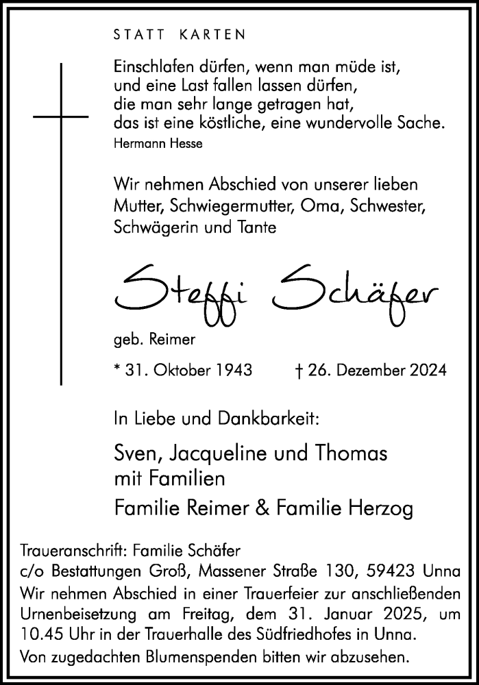 Hier finden Sie alle Traueranzeigen aus der Zeitung, die bisher für Steffi Schäfer erschienen sind. Weitere Traueranzeigen, die in der Zeitung erscheinen, werden hier ebenfalls aufgelistet