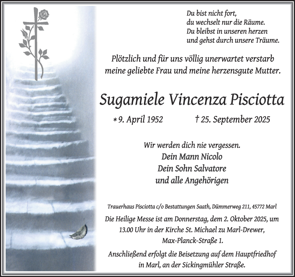 Hier finden Sie alle Traueranzeigen aus der Zeitung, die bisher für Sugamiele Vincenza Pisciotta erschienen sind. Weitere Traueranzeigen, die in der Zeitung erscheinen, werden hier ebenfalls aufgelistet