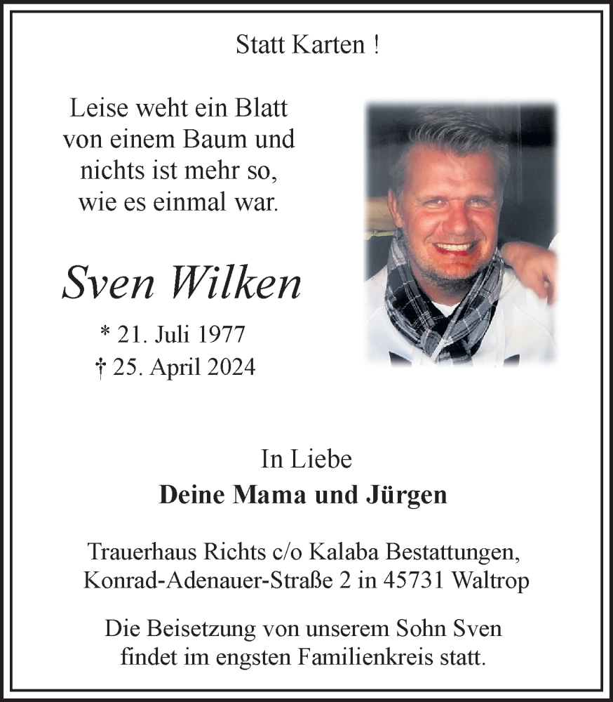 Hier finden Sie alle Traueranzeigen aus der Zeitung, die bisher für Sven Wilken erschienen sind. Weitere Traueranzeigen, die in der Zeitung erscheinen, werden hier ebenfalls aufgelistet