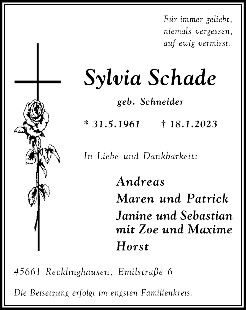 Hier finden Sie alle Traueranzeigen aus der Zeitung, die bisher für Sylvia Schade erschienen sind. Weitere Traueranzeigen, die in der Zeitung erscheinen, werden hier ebenfalls aufgelistet