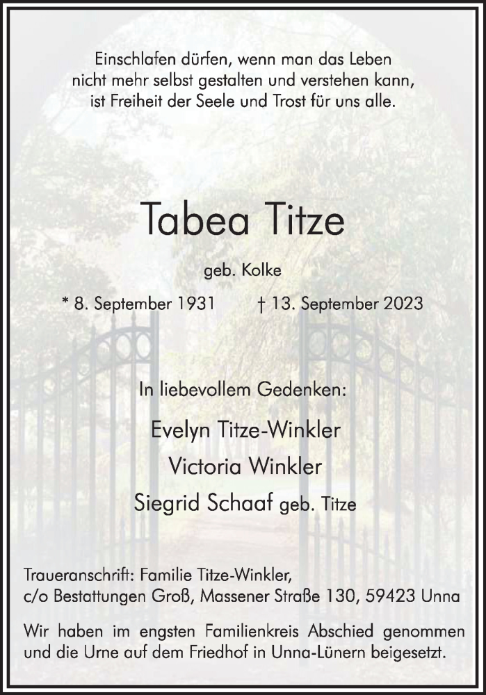 Hier finden Sie alle Traueranzeigen aus der Zeitung, die bisher für Tabea Titze erschienen sind. Weitere Traueranzeigen, die in der Zeitung erscheinen, werden hier ebenfalls aufgelistet