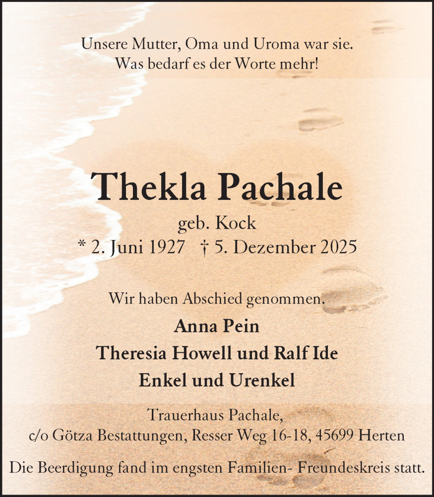 Hier finden Sie alle Traueranzeigen aus der Zeitung, die bisher für Thekla Pachale erschienen sind. Weitere Traueranzeigen, die in der Zeitung erscheinen, werden hier ebenfalls aufgelistet