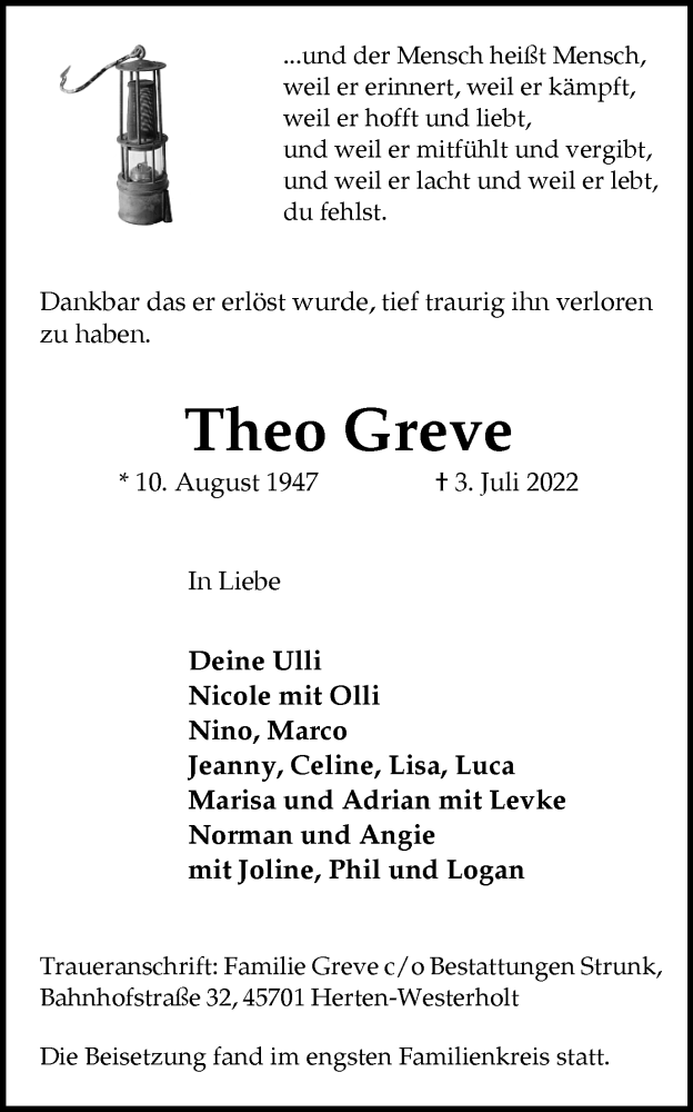 Hier finden Sie alle Traueranzeigen aus der Zeitung, die bisher für Theo Greve erschienen sind. Weitere Traueranzeigen, die in der Zeitung erscheinen, werden hier ebenfalls aufgelistet