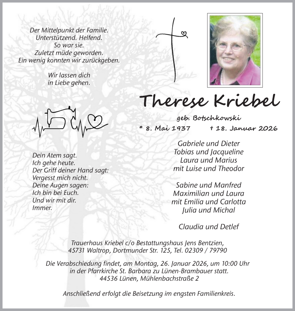 Hier finden Sie alle Traueranzeigen aus der Zeitung, die bisher für Therese Kriebel erschienen sind. Weitere Traueranzeigen, die in der Zeitung erscheinen, werden hier ebenfalls aufgelistet