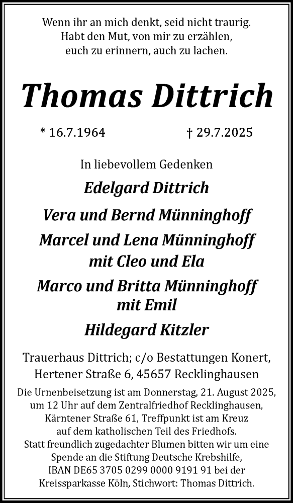 Hier finden Sie alle Traueranzeigen aus der Zeitung, die bisher für Thomas Dittrich erschienen sind. Weitere Traueranzeigen, die in der Zeitung erscheinen, werden hier ebenfalls aufgelistet