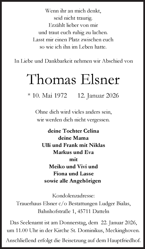 Hier finden Sie alle Traueranzeigen aus der Zeitung, die bisher für Thomas Elsner erschienen sind. Weitere Traueranzeigen, die in der Zeitung erscheinen, werden hier ebenfalls aufgelistet