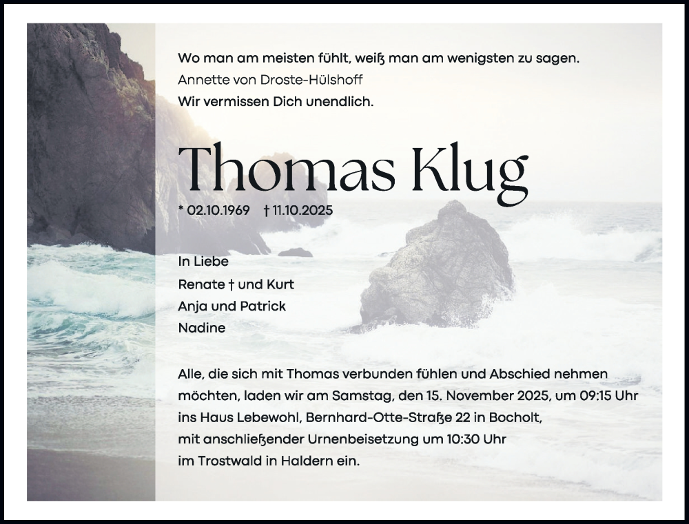 Hier finden Sie alle Traueranzeigen aus der Zeitung, die bisher für Thomas Klug erschienen sind. Weitere Traueranzeigen, die in der Zeitung erscheinen, werden hier ebenfalls aufgelistet